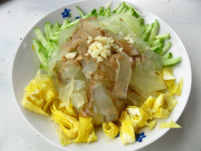2:粉皮卷、鸡蛋饼、黄瓜切丝摆盘,放上蒜末。