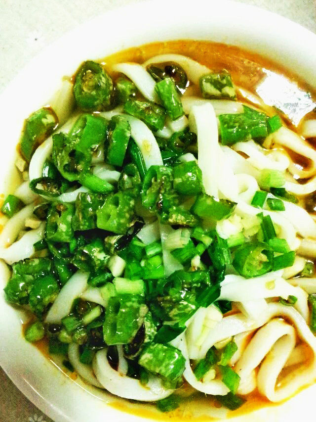6:豌豆尖放最下面打底,倒上米粉后,放葱花和小尖椒即可
