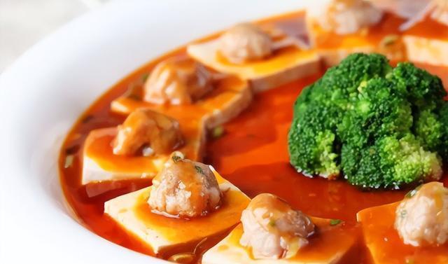 2、把牛肉馅挤成丸子,放在豆腐块中间的小孔内,逐一制完后,摆在圆盘边上并入笼蒸10分钟。取出来后,在盘子的中间位置摆上汆熟的西兰花。