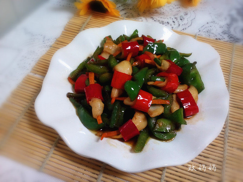 10:炒至青椒断生,加入墨鱼肉卷翻炒。