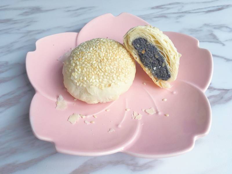 18:把搓成团子的黑芝麻馅儿,像包汤圆一样地包入酥皮中即可