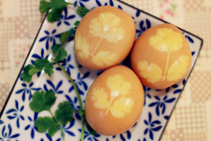 9:揭开纱布,将香菜叶抹去,漂亮的花纹就印在卤蛋上面了…