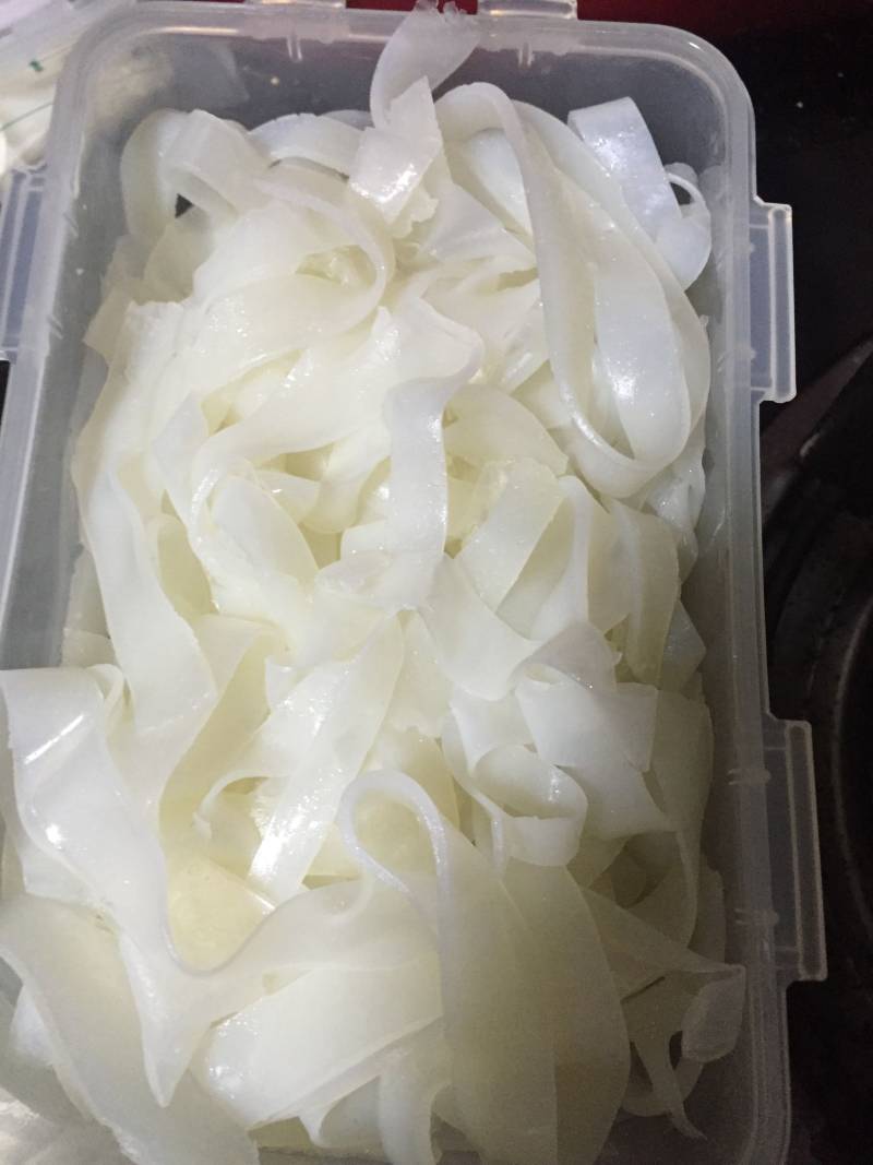 10:切凉皮。放凉的凉皮切条,宽窄依个人喜好。因为我是放到明天吃所以没有拌调料。