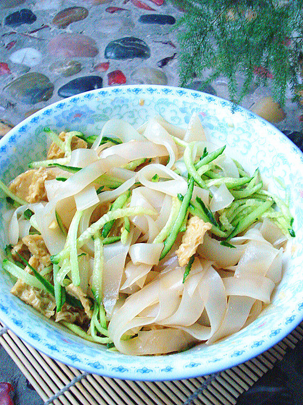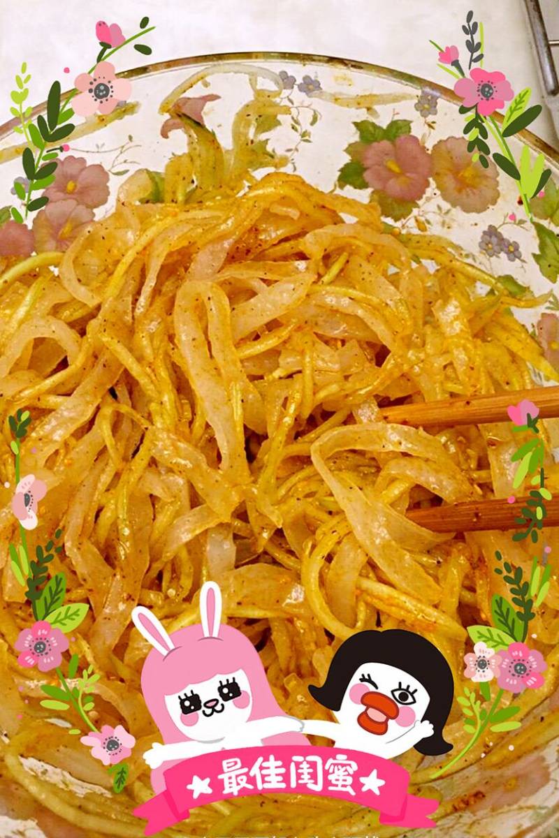 7:蒸熟的凉皮,切成宽窄适中的条状,加入自己喜欢的调料拌匀即可。