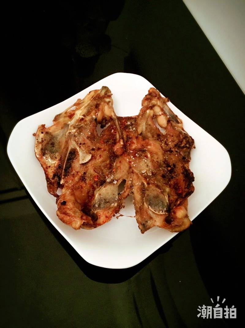 2:取出鸡架,用吸油纸吸干铝箔纸上的油。鸡架翻面,加入糖,孜然,辣椒面等喜欢的调料,继续230度,烤20分钟。