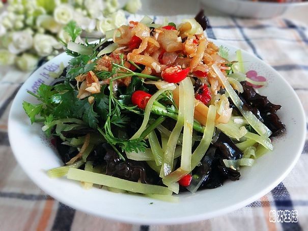 水发黑木耳150克;青笋200克;酸子姜50克;