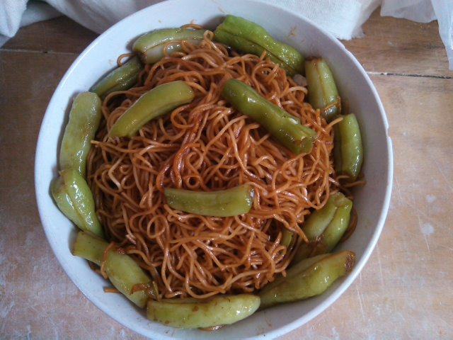 12:面条放入炒好的菜里,翻拌均匀,使面条均匀的沾上菜汤上色。