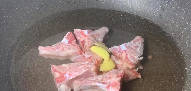 第一步:买回来的脊骨,先用水冲洗干净,然后冷水下锅,加一勺料酒和几片生姜,开大火焯水。
