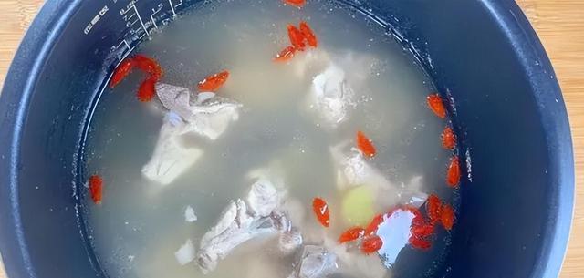 第四步:炖到一个多小时,汤已经变得浓郁醇白,薏米开花了,红枣也胖嘟嘟的浮在面上。这时候把枸杞撒进去,再煮5分钟。