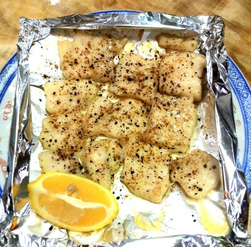 8:出炉后趁热在上面洒少许柠檬汁,即可连锡纸一起装盘了。柠香姜汁烤鱼表层焦香,下层肉质鲜嫩,咸鲜可口。
