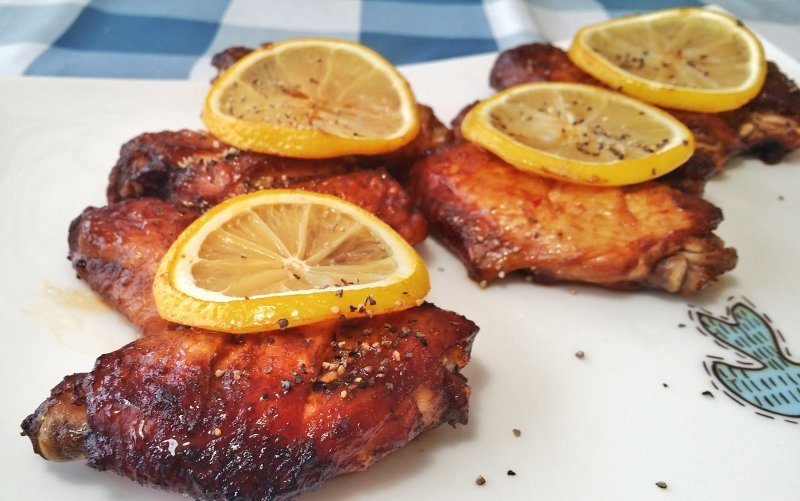 7:挤一点柠檬汁浇在鸡翅表面,再把柠檬片也正背刷好蜂蜜,置于鸡翅之上