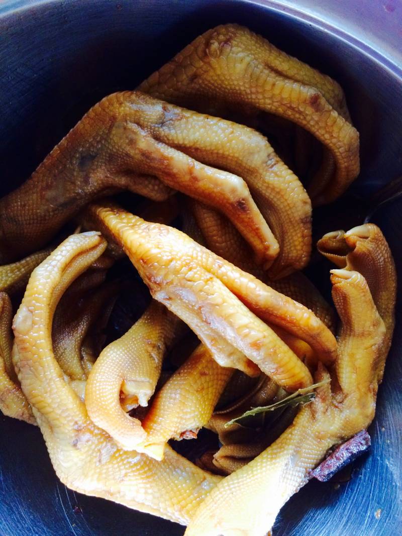 1:鸭掌洗干净,剪去趾甲。把脚杆和脚掌相连部分掰开,就是尽量把关节部分能掰开尽量掰开。这样方便煮好后脱骨。