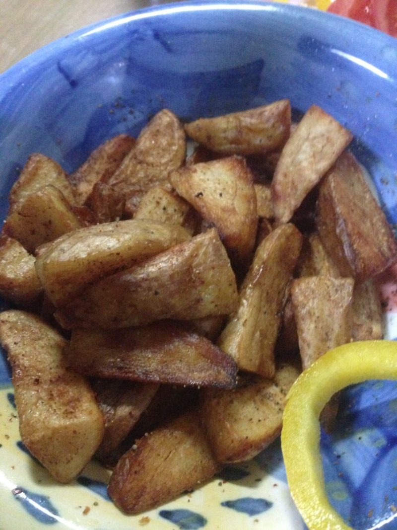 4:在炸好的薯角中,根据自己的口味撒入辣椒粉、孜然粉、黑胡椒碎、盐。
