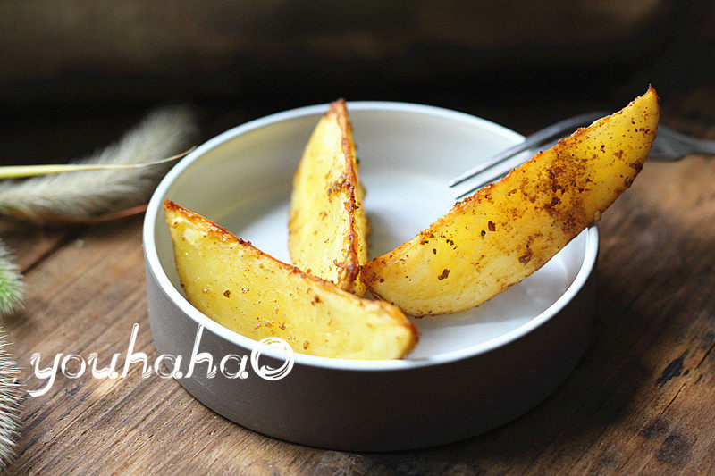 1:将土豆去皮洗净,先对半切开,再切成月牙状,放入所有佐料拌匀