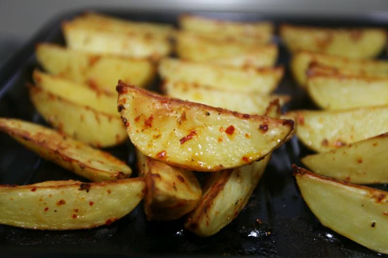 8:戴上隔热手套取出烤盘将薯角翻面。