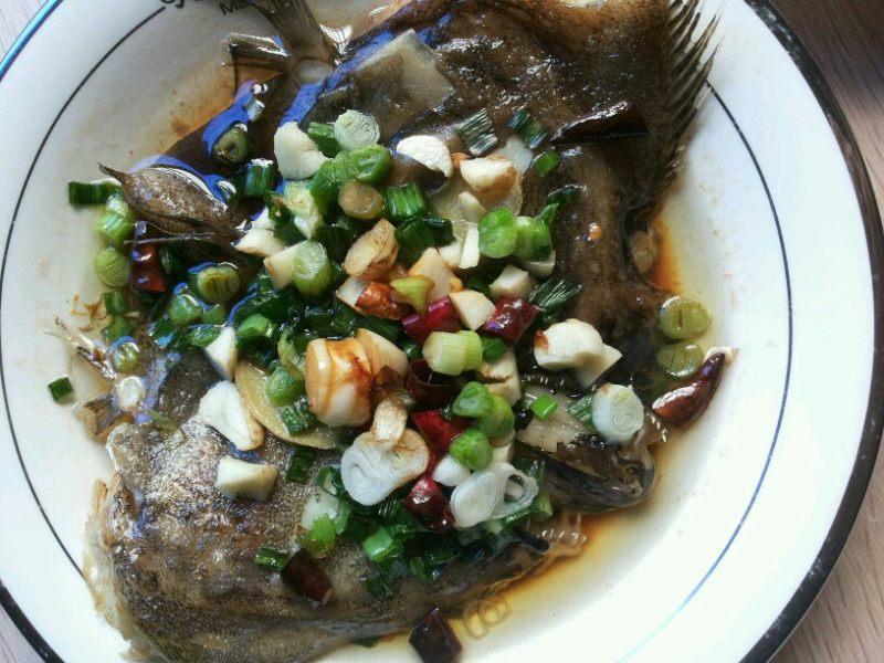 4:将切好的香料码放到鱼头上,我的顺序是最下层是蒜头丁、然后是葱叶末、接着是干辣椒段、再是葱头末、最后淋上生抽(我用的是美味鲜的酱油)