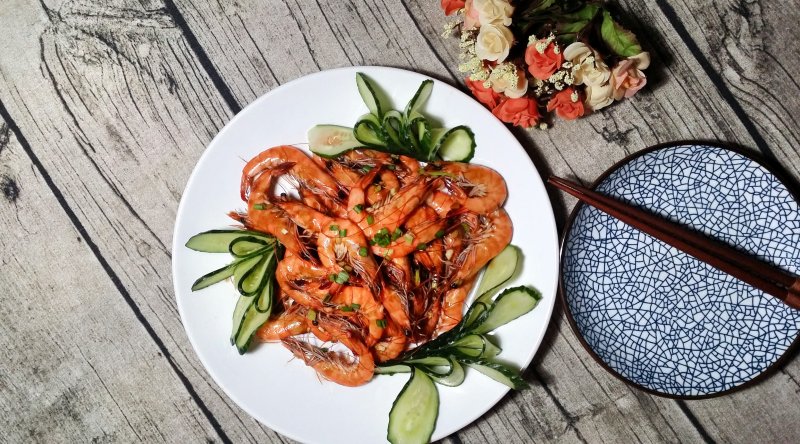 10:大虾装盘后,把之前处理好的黄瓜,相隔的一片弯曲卷在另一片中间,卷三片,就形成了一个简单的花形装饰