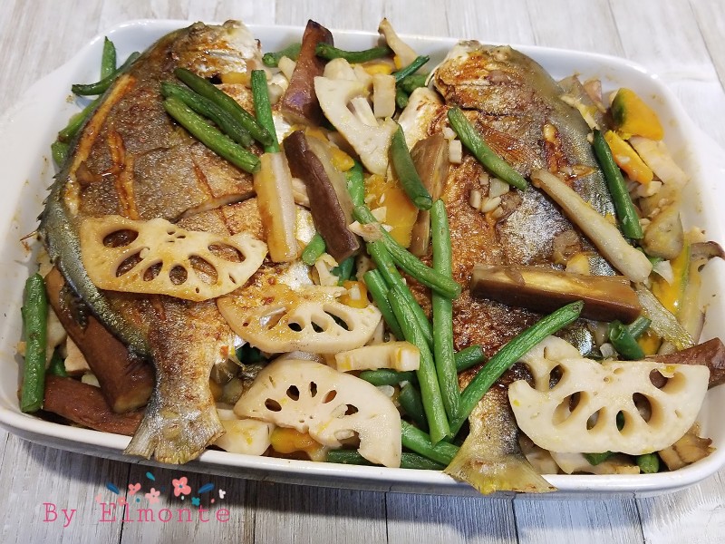 金鲳鱼2条;茄子2条;日本小南瓜1/4个;莲藕1节;四季豆250g;