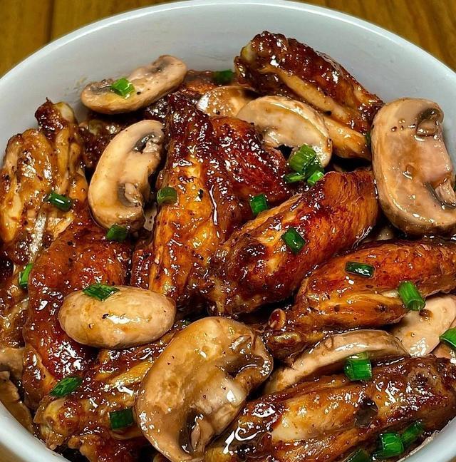 鸡翅,口蘑,小葱,姜丝,生抽,老抽,料酒,胡椒粉,白糖,盐,淀粉