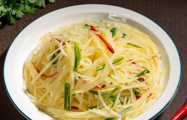 1. 土豆去皮,切成均匀的细丝,放入清水中浸泡5分钟,期间换2次水,洗去表面的淀粉(这样炒出来的土豆丝更脆);捞出沥干水分备用。
