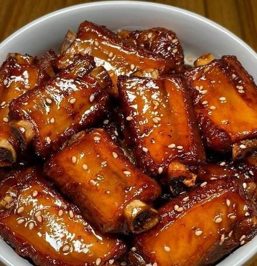 食材:排骨、冰糖、姜、蒜、料酒、生抽、老抽、香醋、盐、白芝麻