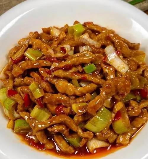 6. 倒入炒好的肉丝,翻炒均匀后倒入调好的鱼香汁,快速翻炒,使食材均匀裹上酱汁即可出锅。