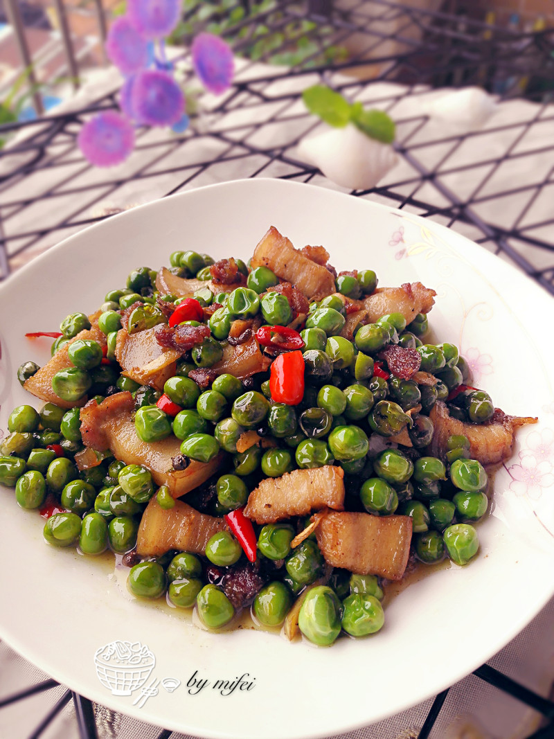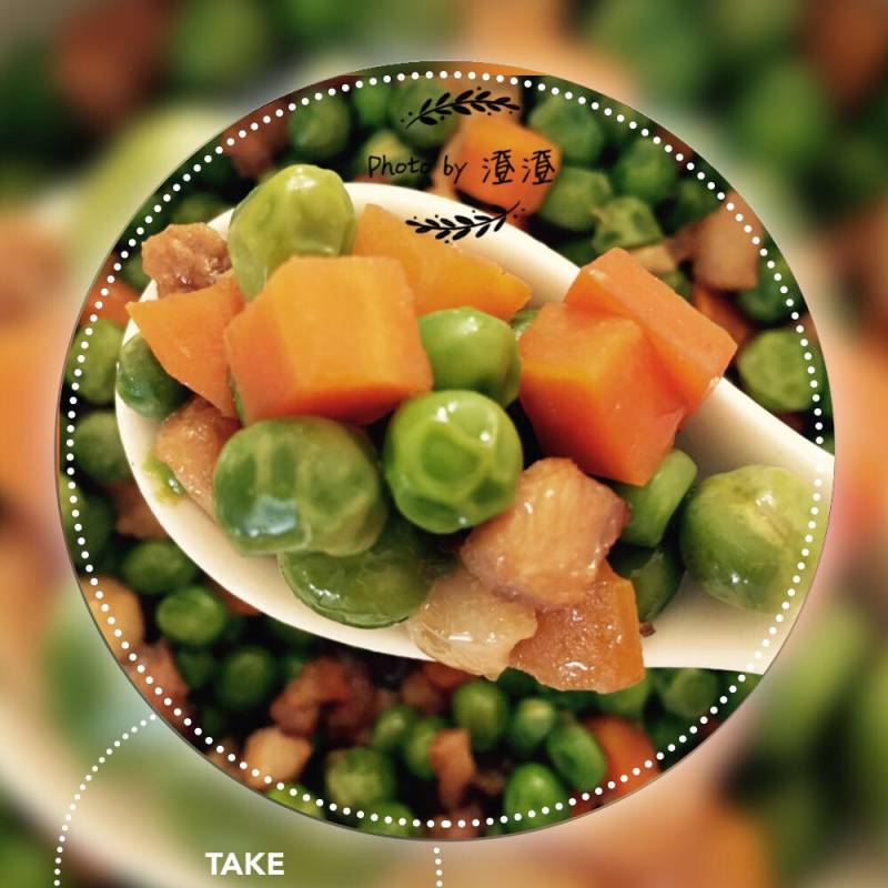 7:出锅前菜中留少许水份,烧得太干,碗豆米会爆开,就不好吃了
