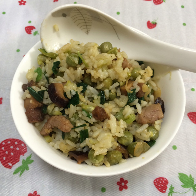 豌豆500克;大米500克;干香菇35克;瘦肉100克;蒜苗150克;