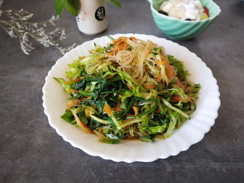 粉丝1卷;油麦菜少许;生抽1大勺;陈醋1大勺;味精少许;香油1勺;花椒油1勺;辣椒油1勺;盐少许;