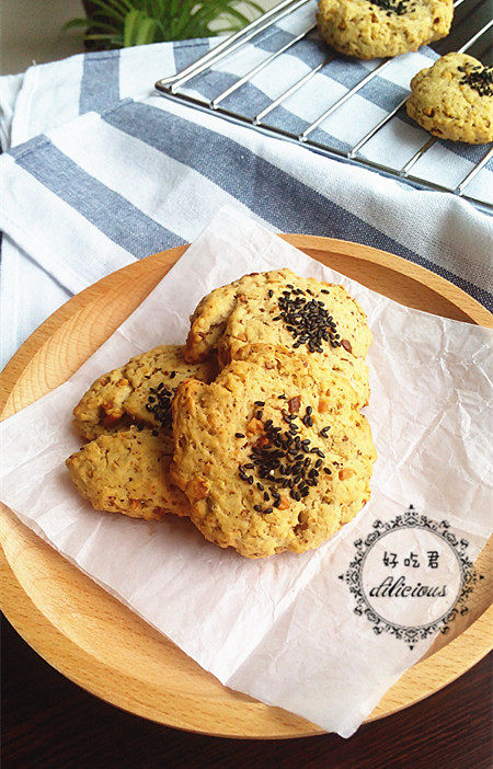 4:分成一个个小团,按压成圆形。放入烤箱170度,烤20分钟,快出锅之前,刷上蛋黄,撒上黑芝麻,烤2。3分钟出锅即可。