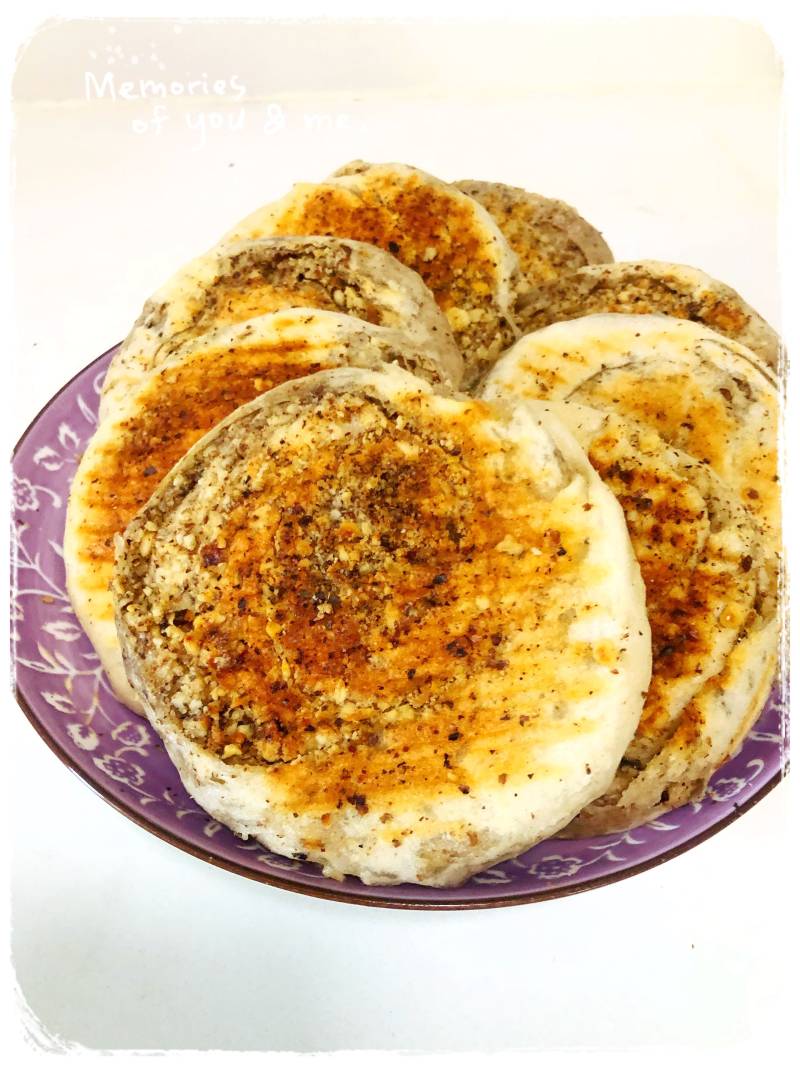 1:一斤面粉放入小袋的发酵粉半袋,发面一小时后备用,核桃敲开取出核桃,洗一下后,用电饼铛烤一下,更酥脆,放到案板上用擀面杖擀碎,刀切一下,放到盆里面,放两勺花椒面,一勺盐,适量的熟油,搅拌均匀备用。