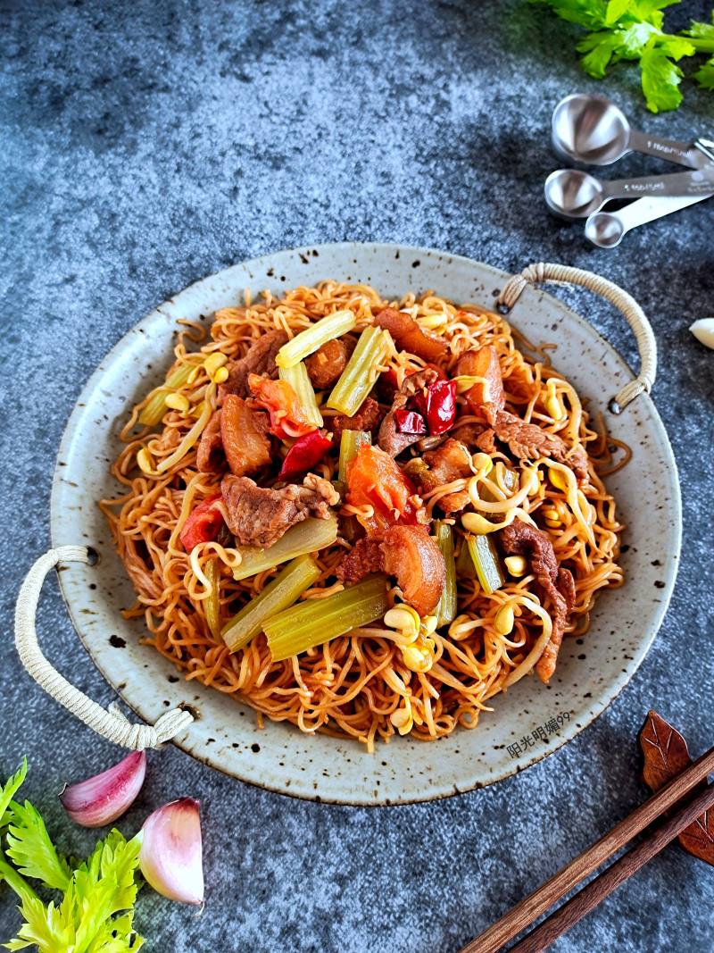 利用蒸面条的时间炒菜,炒菜时先放入不易熟的部分,易熟的配菜最后炒,菜炒至六七成熟就好,因为后面还要蒸制,避免炒过久影响口感。这是一道百吃不厌的家常面食,一碗面肉菜都有了,方便省事又美味!可以根据个人口味搭配喜欢的配菜。