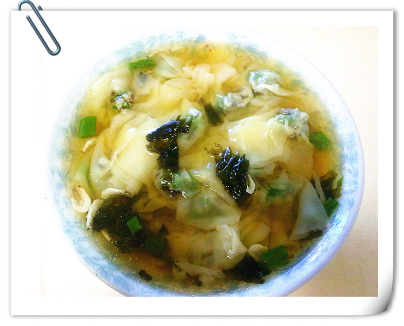 10:好了,烧个紫菜虾米汤,煮2分钟就好。紫菜西红柿也可以。当然鸡汤馄饨也可以。不过我喜欢简单的。