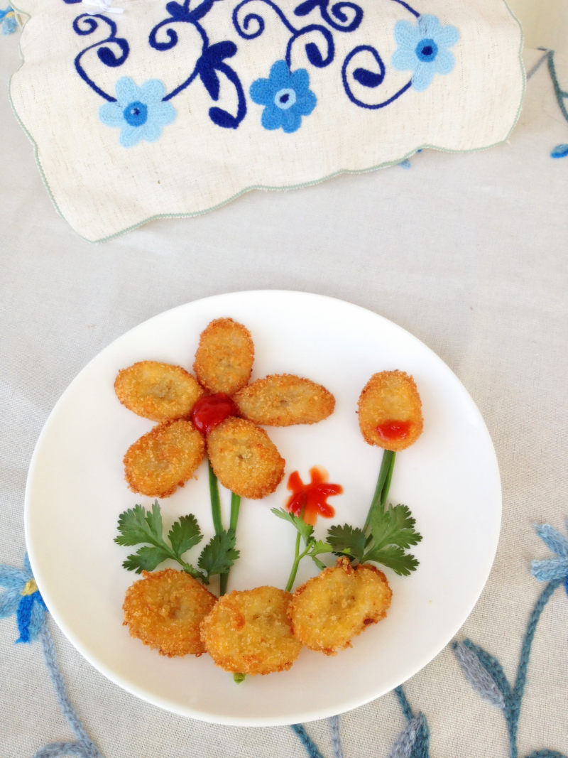 4:将炸好的香蕉片按照想象中的样子摆盘。中间红色的是番茄酱,喜欢其他酱汁的可以改成其他酱汁。花儿的枝干是家里有的韭菜、香菜等绿叶蔬菜,这个不固定。