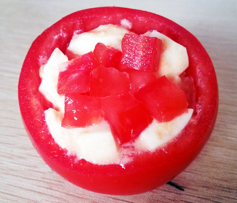 8:将所有食材搅拌好在装入掏空的番茄中
