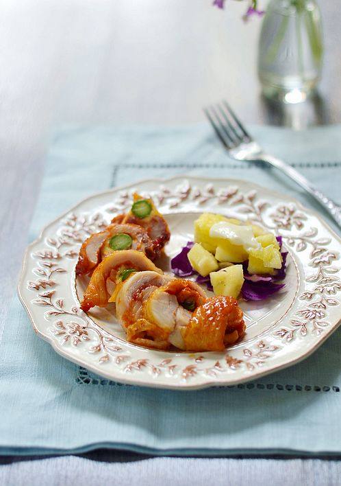 6:哇,烤得香香甜甜的芝心鸡腿出炉了。放凉后把线取出,切片即可食用,再配上杂菜水果沙拉,哇,太小资,太美味了。