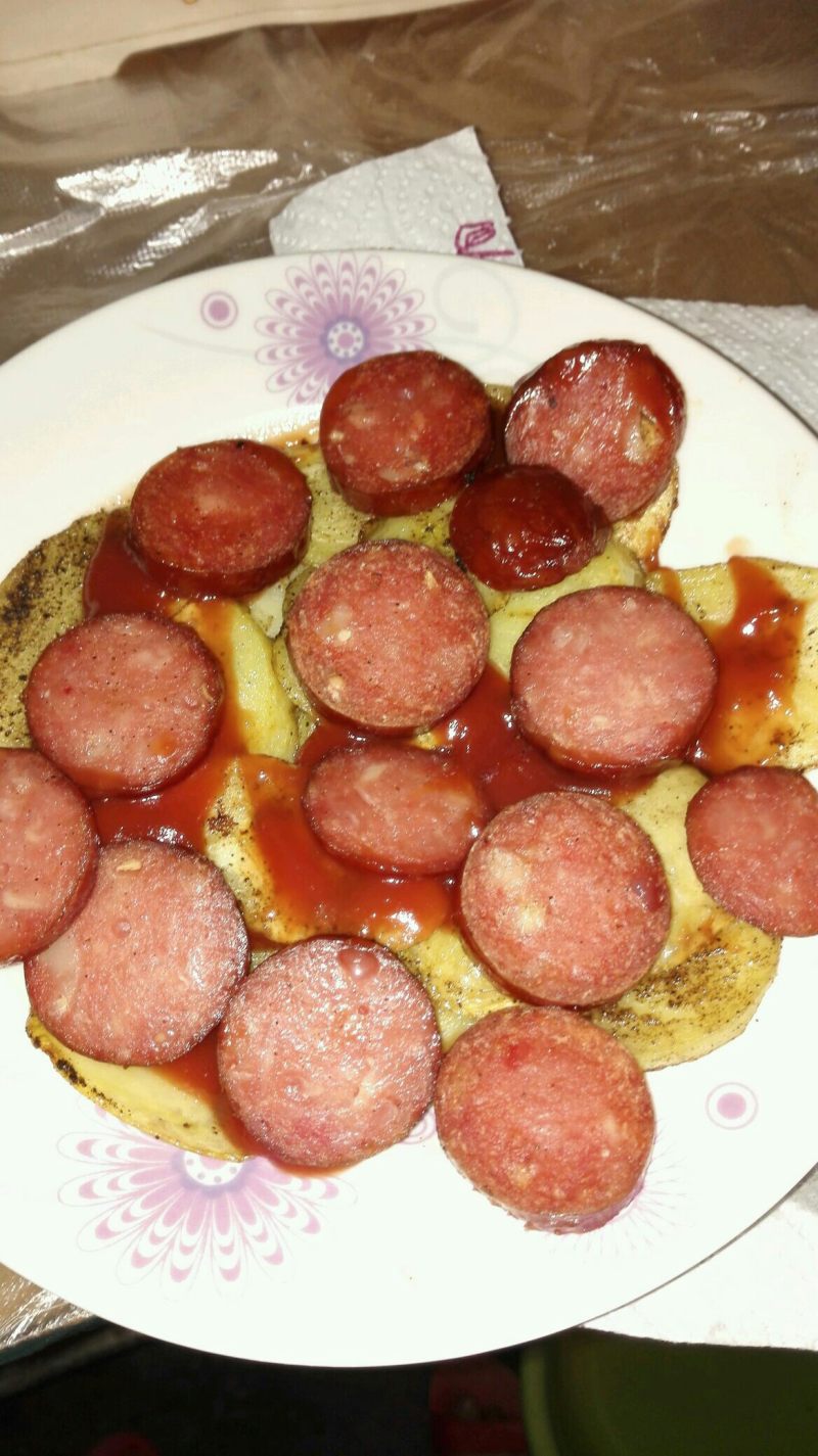 1:材料:烟熏火腿1包,土豆(长形)1只;调料:黑胡椒半茶匙,盐,1茶匙,色拉油1调羹。