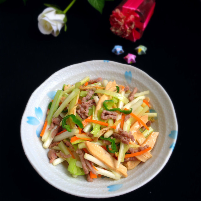 蒜薹300克;里脊肉100克;