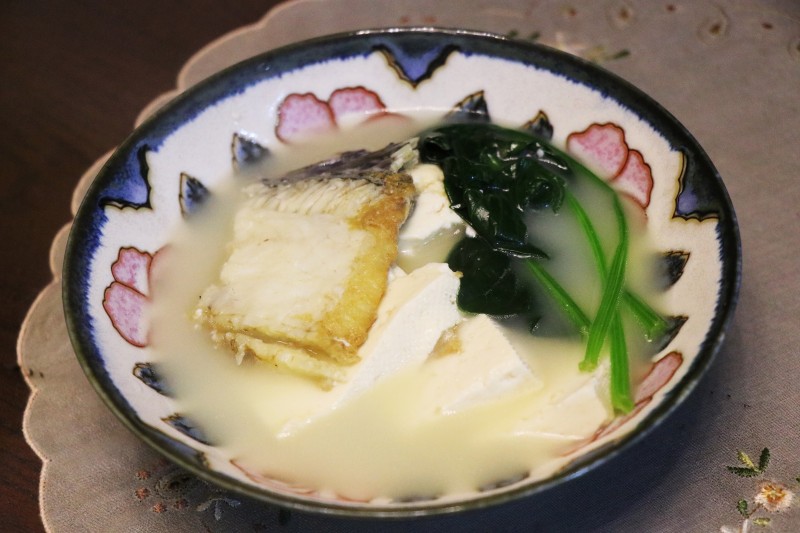 4:鱼骨两面煎黄,放入砂锅,加豆腐、姜,大火烧开以后转小火十分钟,加青菜、盐调味,即可食用。