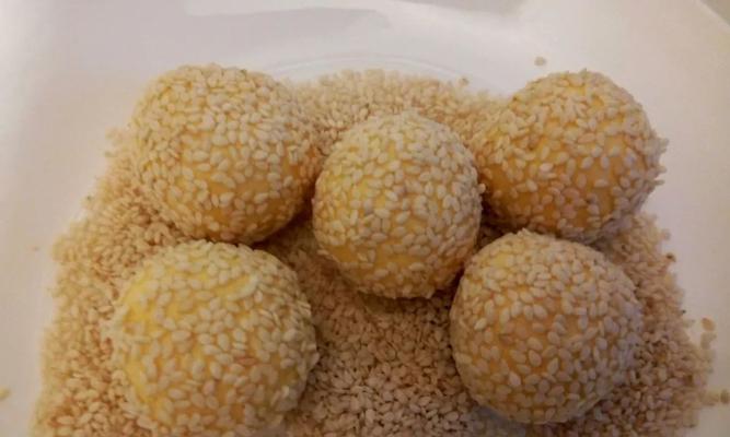 将蘸好蛋液的南瓜球沾上一层芝麻,确保表面均匀沾满。