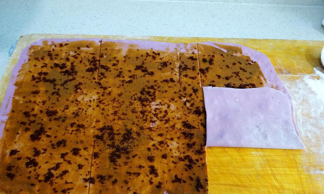 将面团分成若干个小面团,将其中一块面团擀成薄片,刷上芝麻酱馅,再擀上一层薄片,反复操作,直到成为多层的千层饼皮。