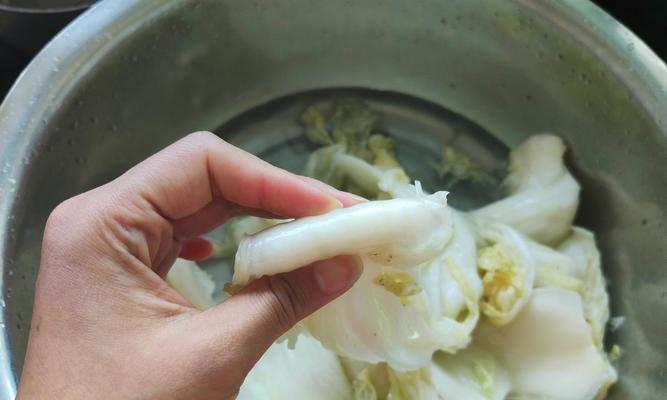 将白菜分开成叶片后,用清水冲洗干净,然后用盐水浸泡30分钟,去除杂质和异味。