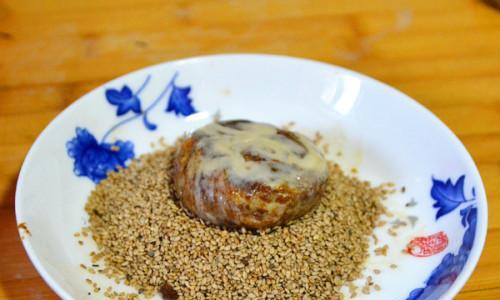 在刷好蛋液之后,将适量的芝麻撒在芝麻火烧表面上。