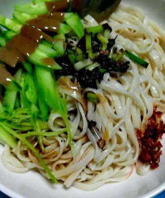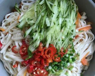拌凉面的时候,一定要把调料和蔬菜均匀地拌匀,这样每一口都能吃到浓郁的芝麻酱味。