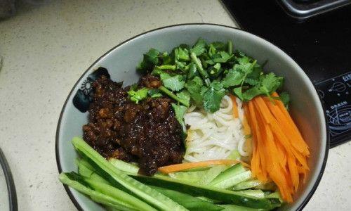 炸酱面细面爽滑,炸酱浓郁鲜香,牛肉肉质鲜嫩,搭配上各种蔬菜和配料,口感多样、丰富。