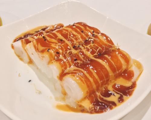 将制作好的蒸斋肠粉摆放在盘子中,然后将调料均匀地浇在上面。