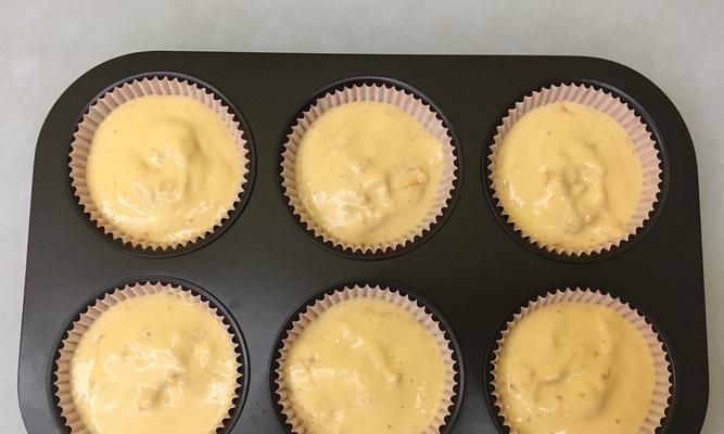 将调制好的面糊倒入准备好的纸杯中,每个纸杯约八分满。为了让蛋糕更加美观,可以在纸杯内壁涂抹少许油。