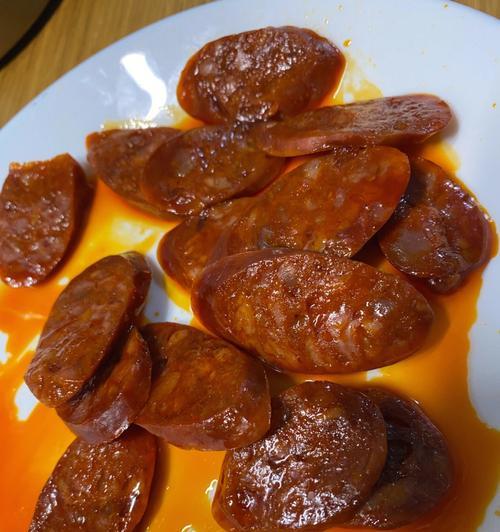将保存好的麻辣香肠取出,切成小片,可以作为下酒菜或者休闲零食品尝,口感香辣可口。