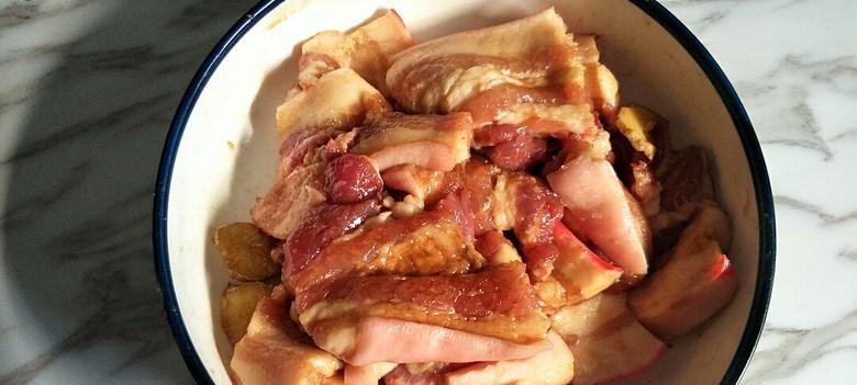 将五花肉均匀地涂上配料,再将咸鱼均匀地铺在五花肉上,入蒸锅蒸制。