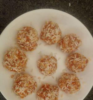 将做好的馅料放入珍珠丸子的面团中心。用手轻轻搓成珍珠状的丸子。